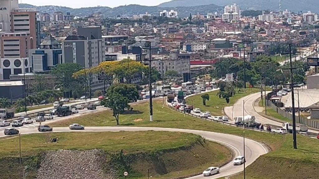 A Via Expressa, no sentido Florianópolis, foi parcialmente interditada devido a um acidente envolvendo dois caminhões e um outro veículo, no km 3 da via, na manhã desta quarta-feira (5), por volta das 10h30.