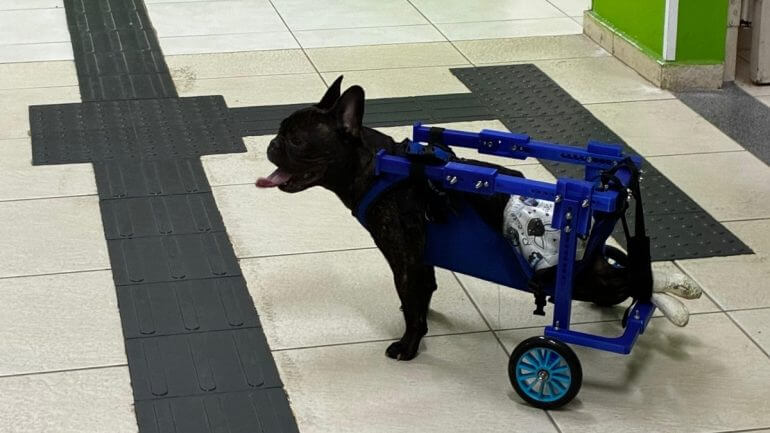 Cachorro emociona ao voltar a andar com cadeira de rodas feita pelo IFSC: “Voando por aí”