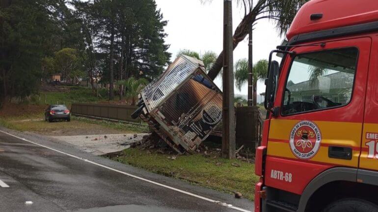 Caminhão tomba e passageiro morre em grave acidente fatal na SC-418; FOTOS