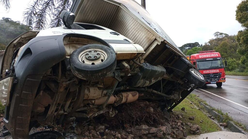 Segundo o Corpo de Bombeiros, o motorista relatou que perdeu o controle do veículo em uma curva, fazendo com que o caminhão de pequeno porte, usado para transporte de cargas, tombasse.