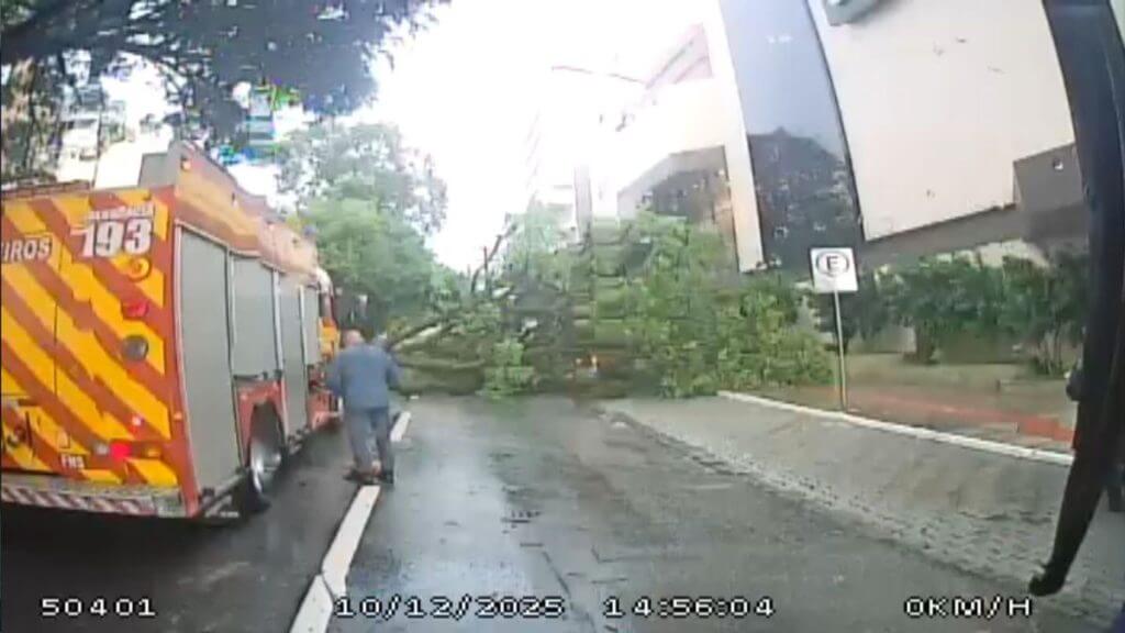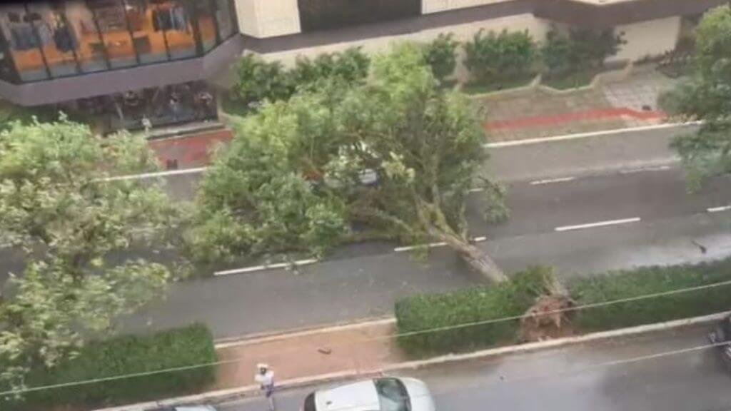 Na Avenida Mauro Ramos, a árvore caiu em via e atingiu um táxi que estava na rua. O motorista estava dentro do carro, mas conseguiu sair do veículo com auxílio de pessoas que estavam por perto.