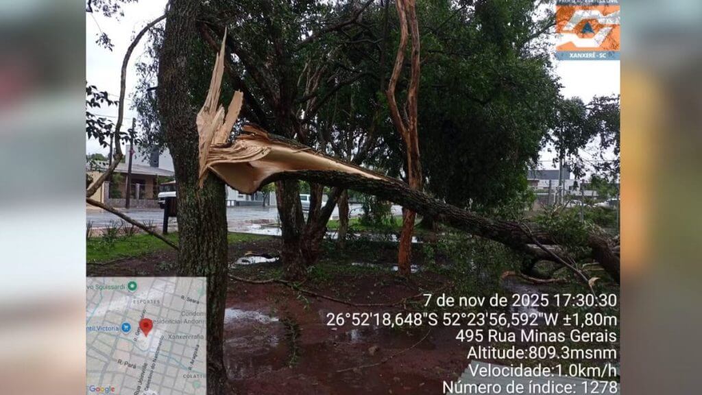 Fotos tiradas pelos moradores mostram o tamanho do rastro de destruição deixado pelos fortes ventos. A Defesa Civil informou que todas as regiões de Santa Catarina devem enfrentar instabilidades nas próximas horas e orienta a população a seguir os avisos oficiais.