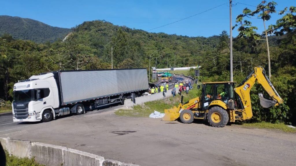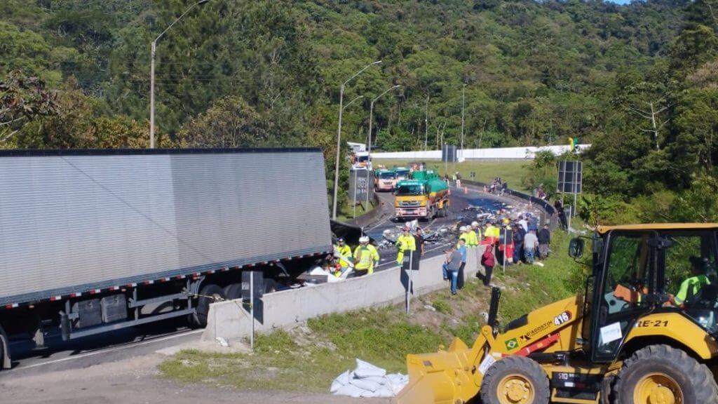 O acidente envolveu um engavetamento entre duas carretas e uma van. Ainda sem informações sobre vítimas.