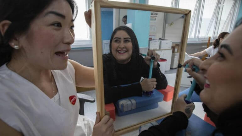 Na instituição, ela reaprendeu a adaptar gestos e movimentos. Com ajuda dos profissionais, criou ferramentas que permitem, por exemplo, passar batom sozinha e alimentar o filho com uma colher especial.