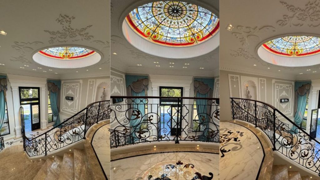 A residência ocupa um terreno de aproximadamente 1.500 m², com cerca de 700 m² de área construída. Entre os destaques da decoração estão os móveis da grife Chateau Blanc, com laqueamento e detalhes folheados a ouro, cortinas de veludo e brocado, além de pedras semipreciosas aplicadas nos acabamentos.