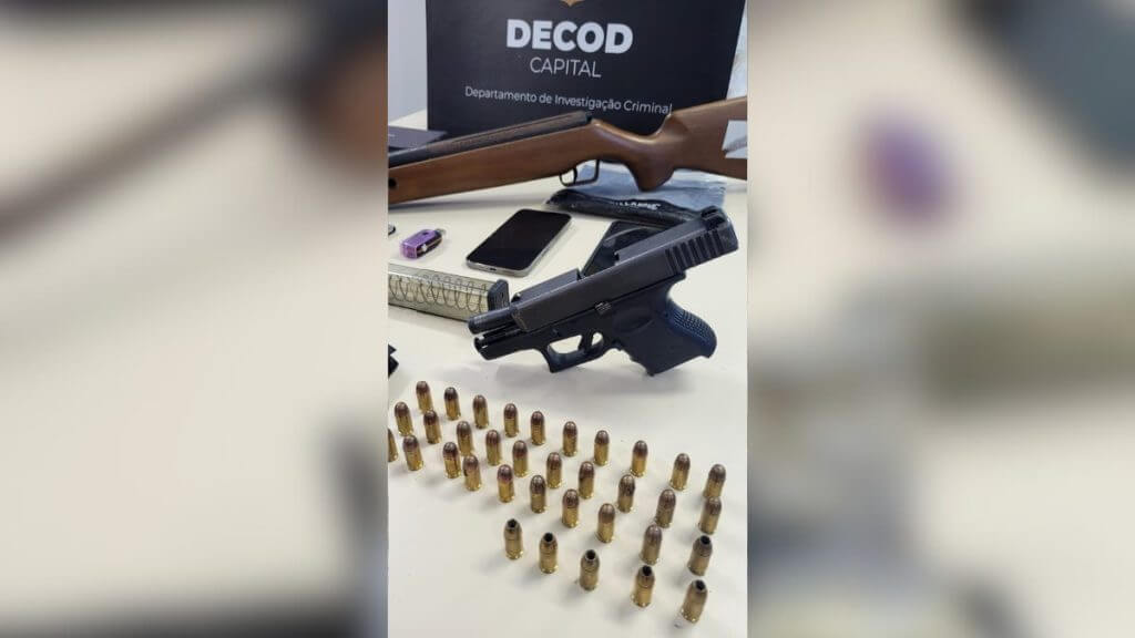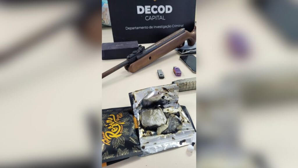 Ao todo, os policiais apreenderam gramas de haxixe e cocaína. Além disso, uma arma de fogo sem registro e com carregador estendido foi apreendida, junto de diversas munições.