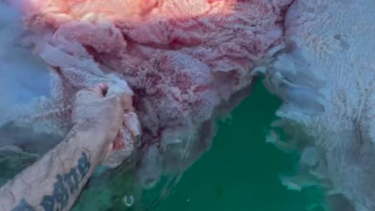 Dois pescadores encontraram uma placenta de baleia nas águas da praia de Naufragados, no Sul de Florianópolis. O registro do encontro raro foi publicado nas redes sociais no sábado (19) e viralizaram na internet.