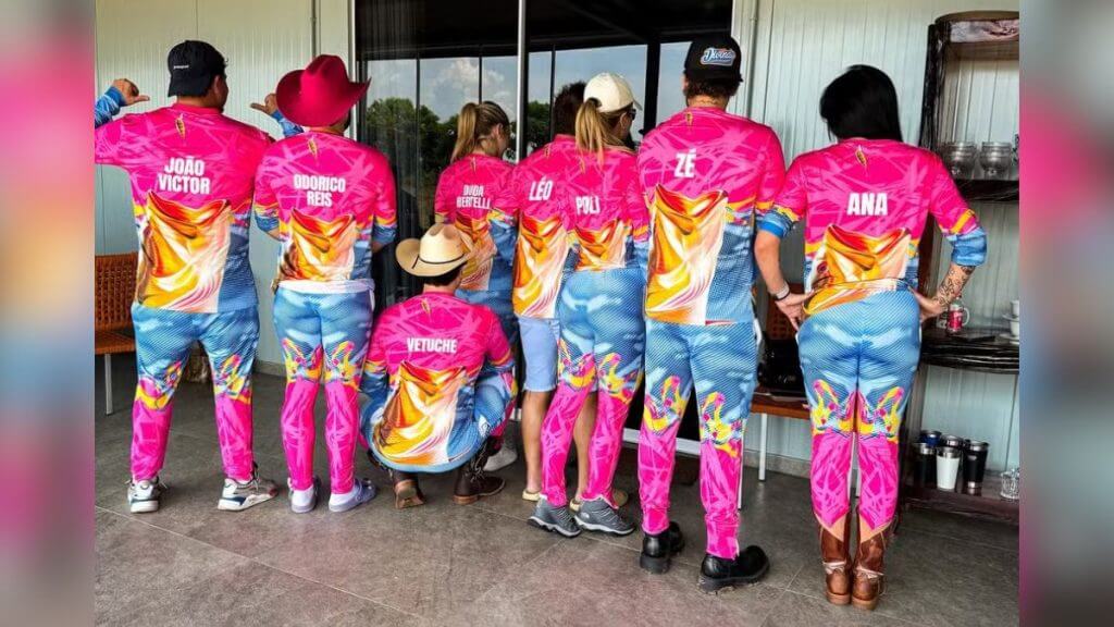 Além dos momentos românticos, o segundo dia de pescaria também ganhou destaque por outro motivo: os figurinos personalizados usados por todo o grupo, que traziam estampados os rostos de todos os integrantes da viagem, incluindo Leonardo, Poliana, Ana Castela, os pais da cantora e outros amigos.