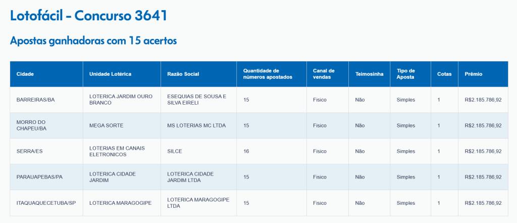 Cinco apostas dividiram o prêmio principal do concurso 3641 da Lotofácil, sorteado na noite desta sexta-feira (20), no Espaço da Sorte, em São Paulo. Cada um dos bilhetes contemplados com 15 acertos receberá o montante de R$ 2.185.786,92.