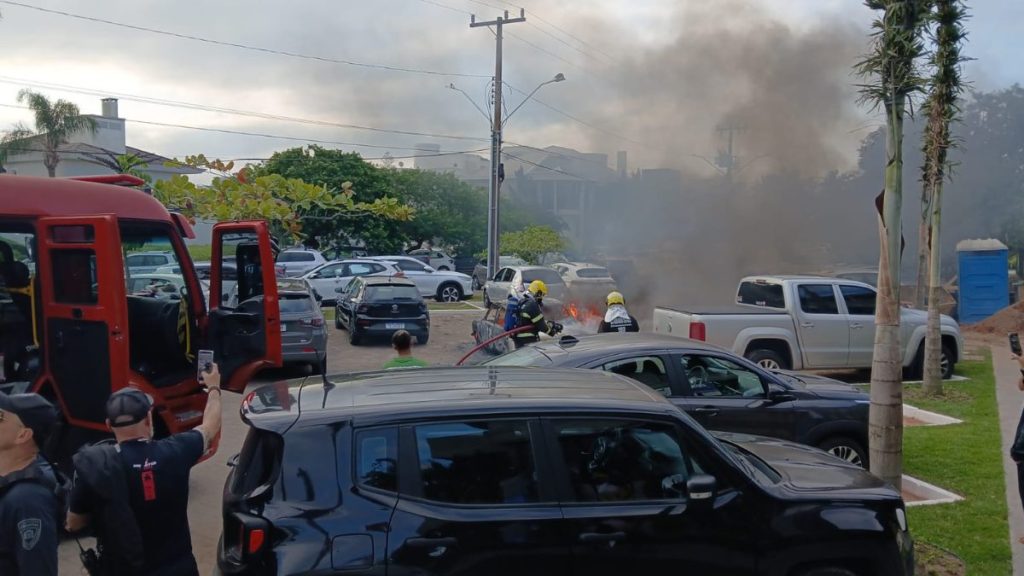 Um carro pegou fogo em um bolsão de estacionamento em Jurerê Internacional na tarde deste domingo (1º). O veículo estava estacionado no local. Ninguém ficou ferido na ocorrência.